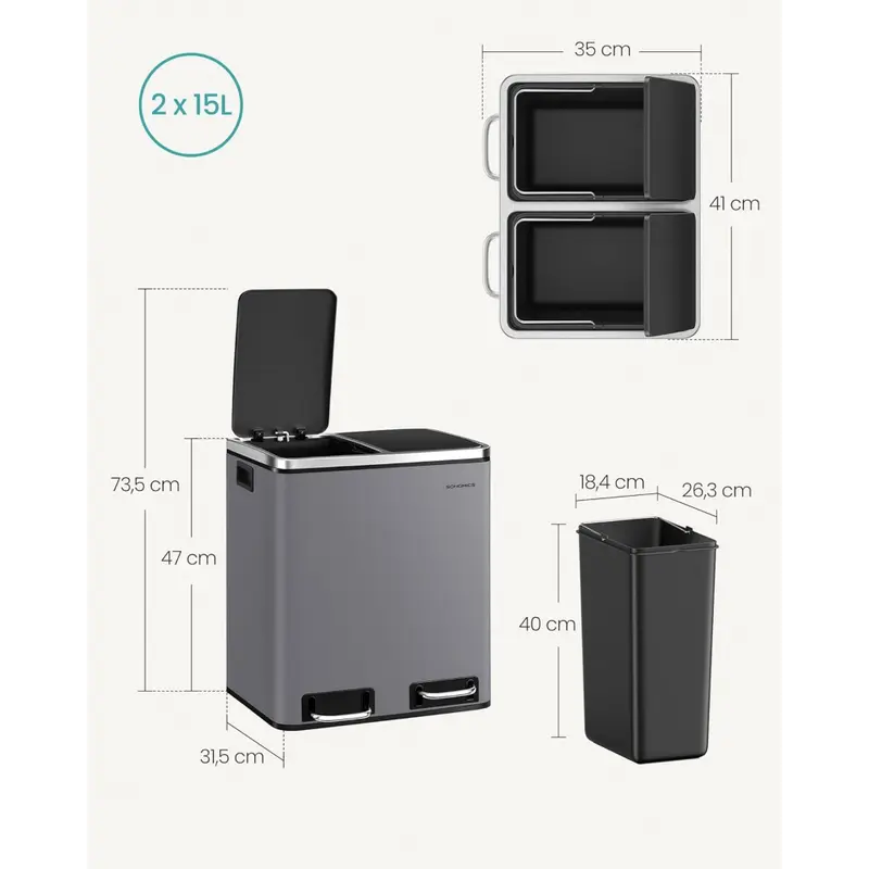 Keuken vuilnisbak, 2 x 15 liter, 2 compartimenten afvalscheidingssysteem, inclusief 15 vuilniszakken, afvalemmer, schopemmer, recyclebaar afval, organisch afval, zacht sluitend deksel, compact ontwerp, roestbestendig, moderne look, verwijderbare binnenemmers, voetpedaal, zacht sluitende deksels, praktische handgrepen